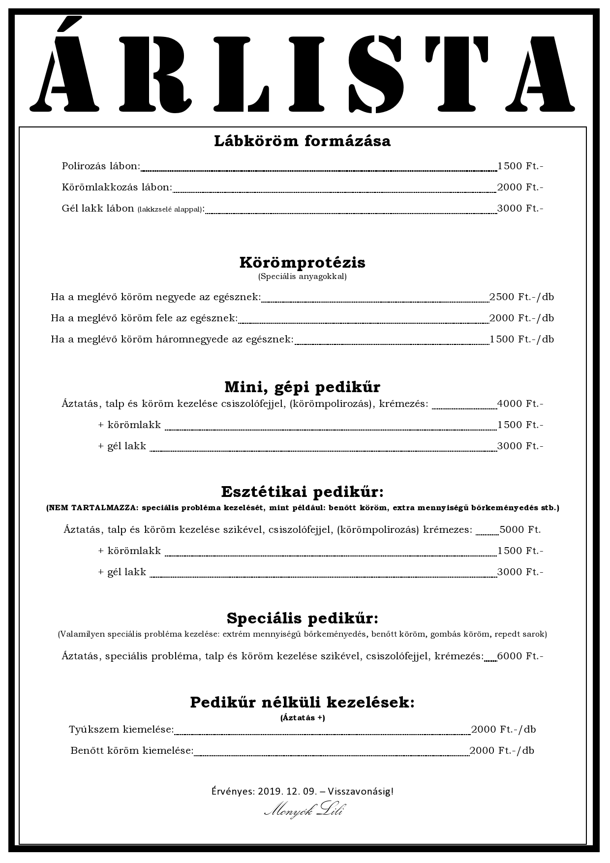 Lábápolás Árlista